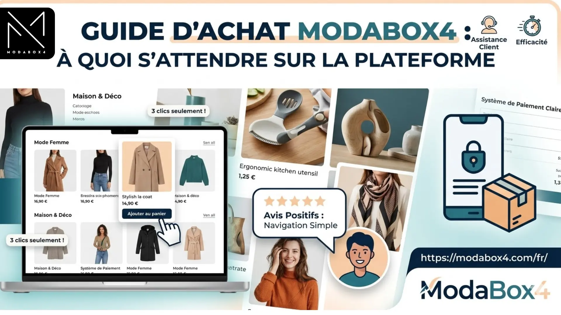 Découvrez ModaBox4 : une plateforme intuitive pour vos achats maison et mode. Navigation simple en 3 clics pour une expérience client optimisée.